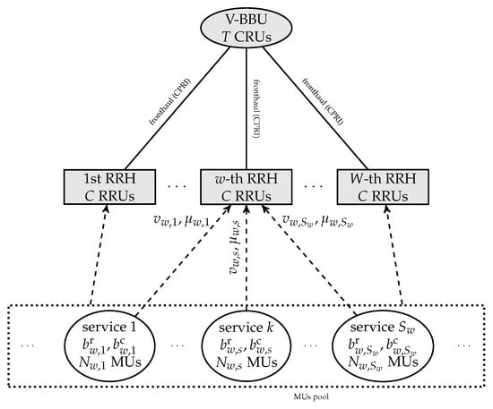 To guarantee, via the C-RAN architecture, quality of service (QoS) to the mobile users (MUs), it is necessary to deploy, in remote sites, many RRHs of certain radio resource units (RRUs) and at the same time form a pool of BBUs, often located in a cloud data center. Such a pooling reduces the baseband processors as well as the power consumption and the overall operators’ capital/operational expenditures [3,4]. Among other advantages of BBU pooling, we mention the possibility of many operators sharing the same BBU pool as well as the more convenient BBU addition/upgrade compared to traditional RAN [5,6]. To benefit from network function virtualization (NFV) [7], we adopt the case of virtualized BBU computational resources (V-BBU) connected to the RRHs assuming a large capacity and low-latency fronthaul, under the common public radio interface (CPRI) [8].