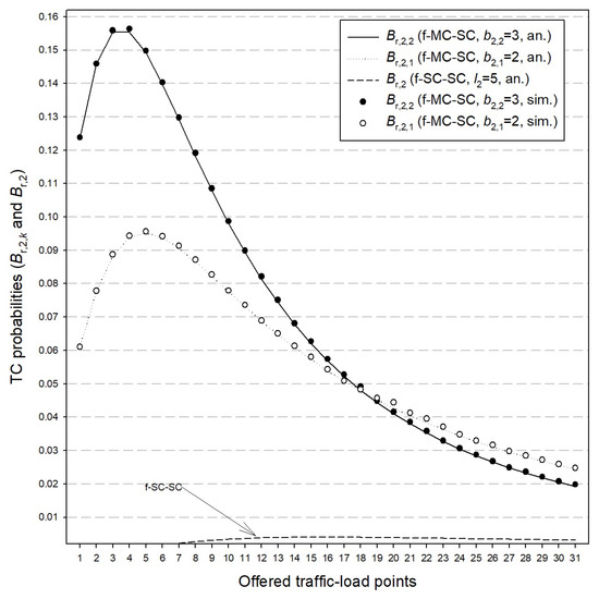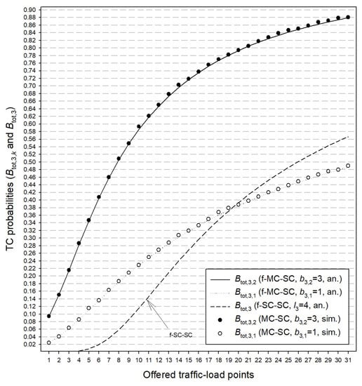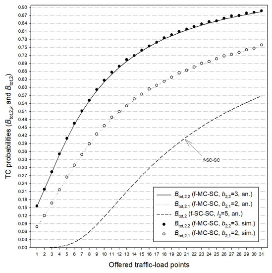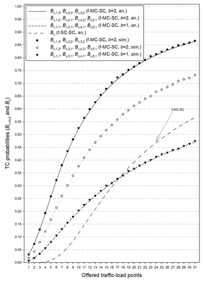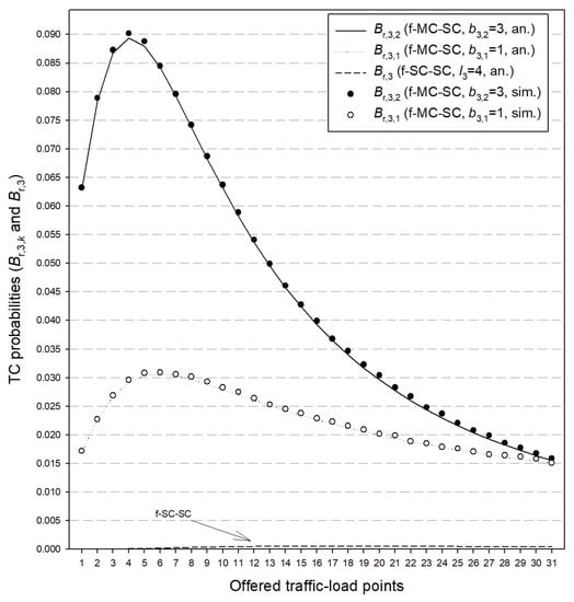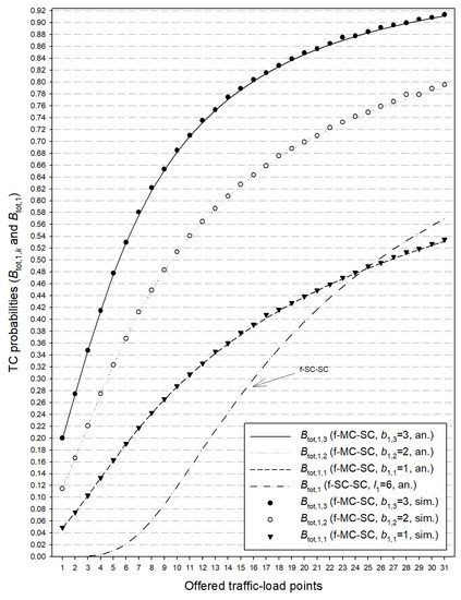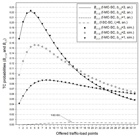 In Figure 3, we present the analytical and simulation TC probabilities results due to the unavailability of CRUs () of the f-MC-SC model and the corresponding (analytical) TC probabilities results () of the f-SC-SC model. According to Figure 3, we conclude that (a) simulation and analytical TC probabilities results are almost identical, (b) the offered traffic-load increase leads to an increase of TC probabilities, and (c) the f-SC-SC model cannot behave similar to the f-MC-SC model because of the fact that the former refers to a single service class model.