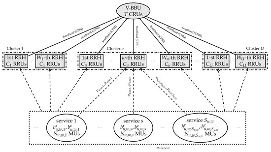 Consider Figure 10 where U clusters of RRHs are presented and are separated from the V-BBU whose capacity remains the same as in the f-MC-SC model (i.e., T CRUs). Cluster u () consists of RRHs. Each of these RRHs has capacity of RRUs.