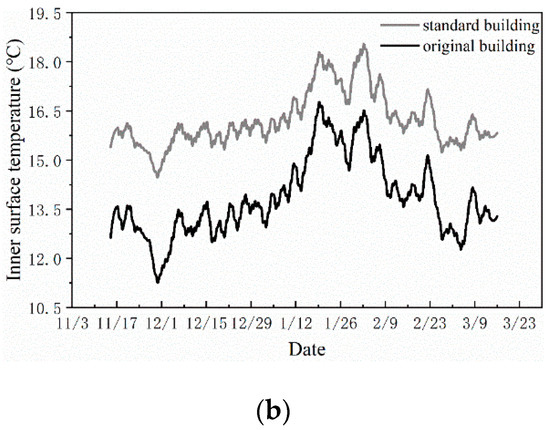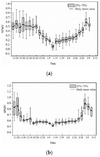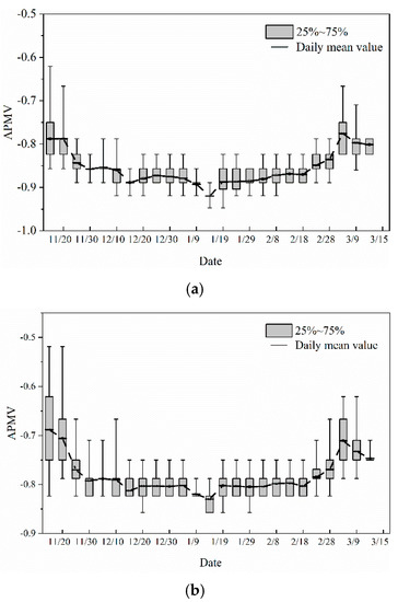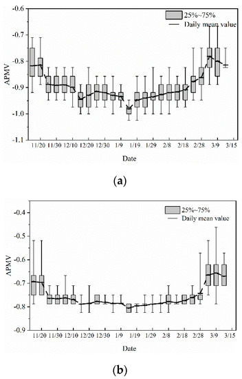 - Setting the building model parameters to control the original building and the specification building are at the same indoor air temperature. The APMV of the original building is always lower than the standard building, indicating that the indoor temperature is not representative of the thermal comfort of the room.