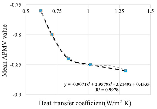- By adjusting the thickness of the insulation layer, the paper obtains the relationship between the heat transfer coefficient and the indoor APMV value. Additionally, according to this equation, the heat transfer coefficient of the envelope should not be higher than 0.5 W/(m2·K) when the room is in comfort.