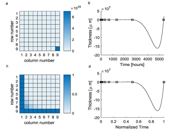 To improve this standard approach, some further time points were added through the use of Equations (6) and (7). In particular, as a result of the first iteration, the time point h was added and the predicted thickness was s(4032) = 47.039 μm. By adding this time point to the experimental data set (i.e., new total number of detections ), the resulting approximating function (Figure 2b) was characterized by the vector (see Table 2, column 1). In this case, at h, the predicted thickness was μm because of the arising numerical oscillations.