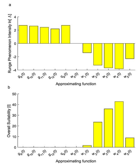 Finally, the overall performances of each candidate function were compared through the use of Equation (12). In particular, this metric was directly proportional to the ability of each candidate function to explain the variance of experimental data while it was inversely proportional to the difference between the maximum and the minimum values of the approximating function. Similarly, it was inversely proportional to the sum of the square errors increased of 1 (to avoid inconsistent values when , e.g., for Lagrange polynomials), as well as to the metric, accounting for the onset of the Runge phenomenon. Through the use of Equation (12), the best candidate function was found for the family described in Equation (10) with .
