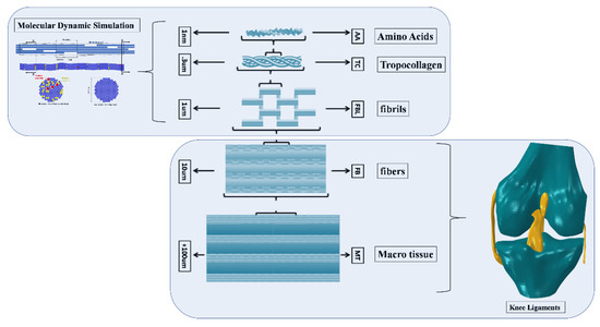 - Adouni, M.; Mbarki, R.; Al Khatib, F.; Eilaghi, A. Multiscale modeling of knee ligament biomechanics. Int. J. Numer. Methods Biomed. Eng. 2021, 37, e3413. [Google Scholar] [CrossRef] [PubMed]