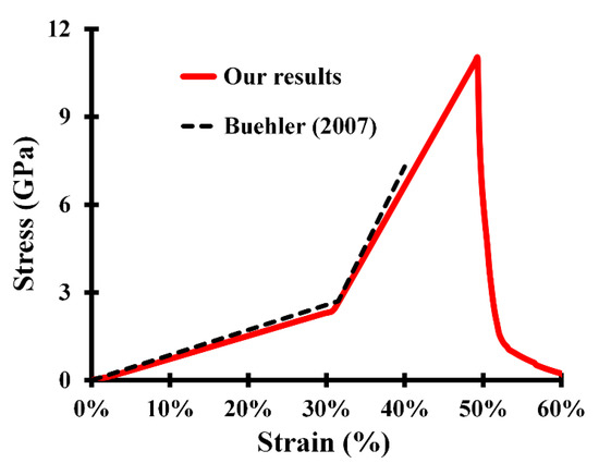 - Buehler, M.J. Nanomechanics of collagen fibrils under varying cross-link densities: Atomistic and continuum studies. J. Mech. Behav. Biomed. Mater. 2008, 1, 59–67. [Google Scholar] [CrossRef]