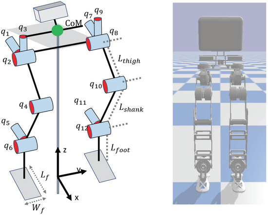 - Kajita, S.; Kanehiro, F.; Kaneko, K.; Fujiwara, K.; Harada, K.; Yokoi, K.; Hirukawa, H. Biped walking pattern generation by using preview control of zero-moment point. In Proceedings of the IEEE International Conference on Robotics and Automation, Taipei, Taiwan, 14–19 September 2003; Volume 2, pp. 1620–1626. [Google Scholar]
