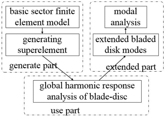 The analysis process of the substructure modal synthesis super-element method is shown in Figure 2. For the modal synthesis super-element method, for the fixed interface prestressed and free interface substructures, the basic idea is that the finite element model of the basic sector of the bladed disk is established by using the substructure analysis method from bottom to top. The two side outlet degrees of freedom (master degrees of freedom) of the basic sectors of the bladed disk are fixed and the working speed is applied to perform the prestressed contact analysis (bladed binding, bladed contact) for each basic sector of the detuned bladed disk. One opens the prestress setting and releases the fixed constraints of the two side exit degrees of freedom (master degrees of freedom) of the basic sector of the bladed disk, and then conducts the modal synthesis generation part analysis of the substructure of the free interface. One then generates a supercell and use supercell nesting technology to generate a multilevel supercell to complete the generation part. Secondly, the superunits are connected to analyze the overall bladed disk system (modal, dynamic response), and the use part is completed. Finally, the condensed solution of the dynamic response of the supercell master degree of freedom is extended to all the degrees of freedom in the supercell, so as to obtain the complete solution of the dynamic response of all the degrees of freedom in the bladed disk system, completing the extension part.