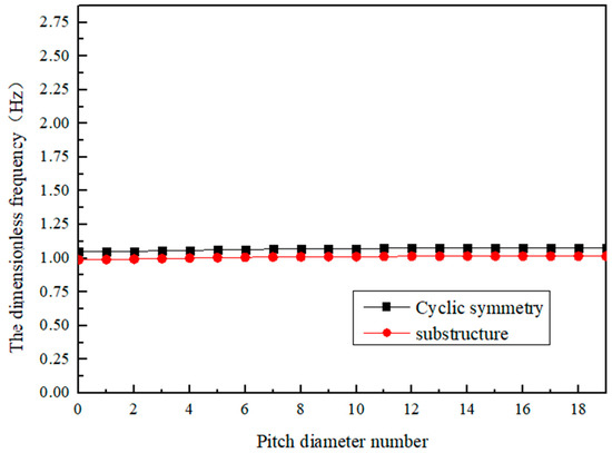 Firstly, the analysis accuracy of the modal synthesis super-element method for prestressed and free interfacial substructures with fixed interfaces was verified. The dynamic frequency of the standard contact bladed disk system under the working speed was analyzed by using the cyclic symmetry analysis method and the modal synthesis super-element method of fixed interface prestressed and free interface substructures, respectively. In Table 1, the dimensionless dynamic frequency and relative error of the homophonic standard contact bladed disk system was calculated by two methods, and the working speeds are given. Figure 3 shows the dynamic frequency curve of the harmonized standard contact bladed disk system calculated by the two methods under the working speed. It can be seen that compared with the cyclic symmetry analysis method, the maximum relative error of the dimensionless dynamic frequency of the modal synthesis super-element method of the prestressed free interface substructure with a fixed interface is 5.68%. Since the number of modes intercepted by the substructures is the same, and the same finite element mesh model is used, the errors of the two methods at each frequency are relatively consistent.