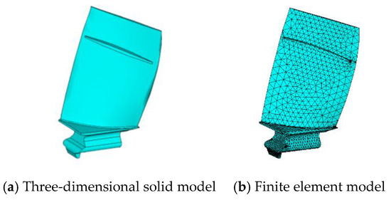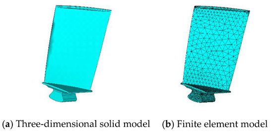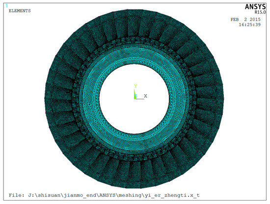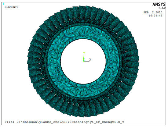 Since the natural vibration characteristics of the blades have a direct impact on the coupled vibration of the bladed disk system, the blades of the first and second stage of the bladed disk system were taken as the research objects, and the static frequency analysis of the two stages was carried out to obtain the inherent vibration characteristics. The three-dimensional solid model of the first- and second-stage bladed disk system and the finite element model of the two-stage blade after meshing are shown in Figure 4 and Figure 5.