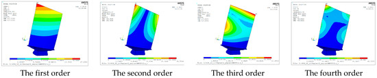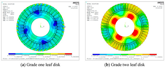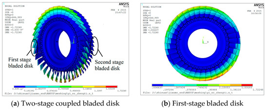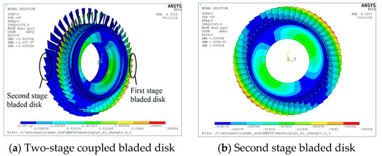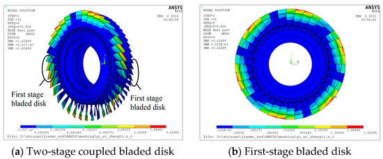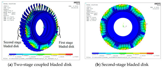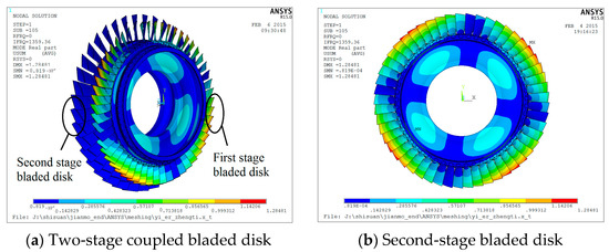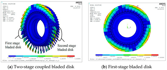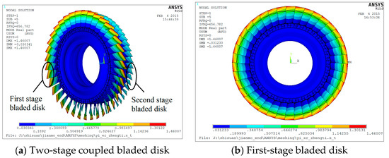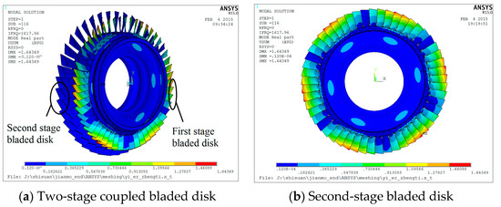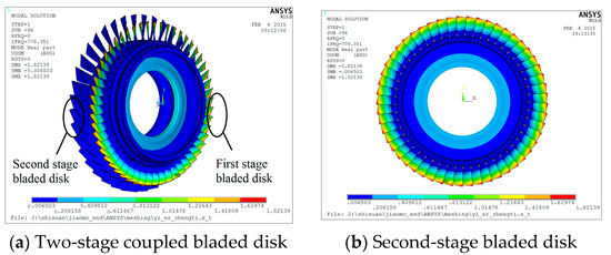 According to the comparison of the natural frequencies and modes of the two-stage bladed disk system and the single-stage bladed disk system in Table 11, it can be seen that the vibration of the bladed disk system has a certain order: the blade vibration is first, followed by the coupled vibration of the bladed disk. At the intersection of the two stages, the interstage coupled vibration of the bladed disk will occur. It can be seen that the natural frequencies and mode shapes of the two-stage bladed disk coupled system not only include the natural frequencies and mode shapes of the first- and second-stage bladed disk, respectively, but also have the coupled modes of the two-stage bladed disk. Therefore, the two-stage bladed disk system model should be chosen to calculate the coupled vibration modes of the two-stage bladed disk system. For the dominant vibration mode of a single-stage disk, a single-stage bladed disk calculation model should be selected.