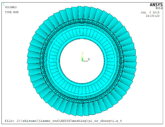 The first-stage bladed disk system model was taken as the object of analysis, and its modal analysis was carried out. Figure 8 shows the three-dimensional solid model of the first-stage bladed disk system, and Figure 9 shows the finite element model of the first-stage bladed disk system. Through modal analysis, the first 150 order natural frequencies and mode shapes of the first-stage blading disk system were calculated and solved. The specific values of natural frequencies of each order are shown in Table 4 and Table 5.