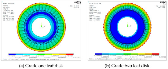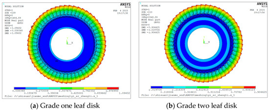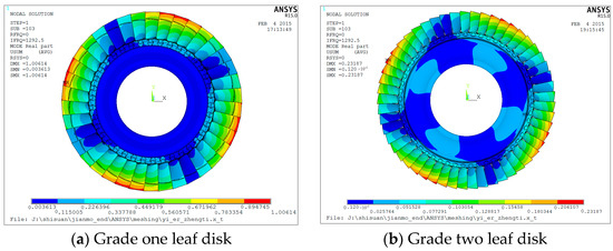 For the order with obvious inter-stage coupled vibration of the two-stage bladed disk system, the maximum vibration displacements of the first-stage bladed disk system and the second-stage bladed disk system are shown in Table 10. Figure 30, Figure 31, Figure 32, Figure 33, Figure 34 and Figure 35 show the inter-stage coupled modes.