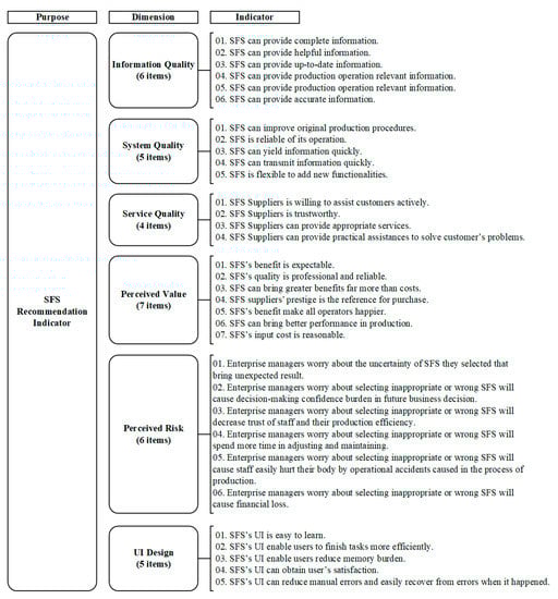 This study proposed 6 Information Quality, 5 System Quality, 5 Service Quality, 23 SFS Function characteristics, 16 Information Security, 8 Perceived Value, 6 Perceived Risk, and 5 UI Design recommendation indicators. In total, there are 74 recommendation indicators.