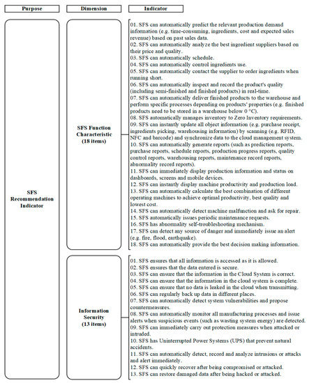 From the above solutions, this study organized SFS Function characteristics, and collated and proposed the following sub-dimensions: 1 Prediction Indicator, 1 Purchasing Indicator, 4 Production Indicators, 2 Quality Control Indicators, 2 Putting in Storage Indicators, 2 Inventory Control Indicators, and 11 Common Functionality Indicators. This led to a total of 23 recommendation indicators, as shown in Table 4.
