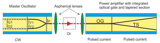 The RW section and the TS of the PA are operated in pulsed mode for generating optical pulses with high peak power and low ASE. The RW section of the PA shown in Figure 3 serves as an optical gate (OG), where the coupled CW beam of the MO is absorbed if no current is injected. On the other hand, the OG becomes transparent, and the optical beam can pass the OG if a current pulse of defined width τOG and amplitude IOG is injected. In this work, the amplitude of the current pulse is IOG = 100 mA. The generated optical pulse is then subsequently amplified in the tapered section, where a current with an amplitude of ITS ≤ 18.4 A is injected. Due to the targeted optical pulse width of 8 ns a pulse width of τOG = 8 ns for the gate current is chosen. To obtain a top-hat profile of the optical pulse, the pulse width τTS has to be longer than τOG, but not too long in order to prevent the generation of ASE after the emission of the optical pulse. The time needed to accumulate enough excess carriers in the active region amounts to several times the carrier lifetime, which is of the order of 1 ns. Hence, the electrical pulse injected into the TS is turned on 3.5 ns before the pulse through the OG is injected as discussed in Refs. [16,17]. Thus, the pulse injected into the OG is delayed by a time τDelay = 3.5 ns with respect to the TS pulse. Similarly, the TS pulse is kept on for a further 3.5 ns after turning off the OG pulse. Therefore, a pulse width of τTS = 15 ns is selected. The repetition rate of the current pulses injected into both sections (OG and TS) is f = 25 kHz. The current pulses injected into the OG and the TS are generated by driver circuits based on GaN transistors as described in Ref. [26]. In the following, the electro-optical characteristics, including the spectral properties of the MO as well as the MOPA configuration are given.