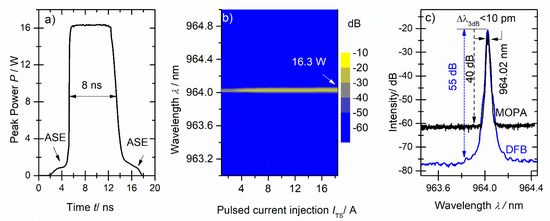 The results for a seed wavelength of 964.02 nm, corresponding to an operation of the first branch of the Y-DFB laser (IG1 = 130 mA, IG2 = 0 mA), are shown in Figure 5. An optical pulse width of 8 ns and a plateau optical peak power of the MOPA system of 16.3 W is obtained. At the leading and training edges of the optical pulse, small amounts of ASE are visible in Figure 5a.