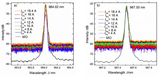 The results for a seeding wavelength of 967.50 nm, corresponding to an operation of the second branch of the Y-DFB laser (IG1 = 130 mA, IG2 = 0 mA) shown in Figure 6 are very similar to those shown in Figure 5. When changing the temperature to TMO = 35 °C and fixing all other conditions, the same optical peak power of 16.3 W for the wavelength pair 964.33 nm and 967.81 nm is obtained (not shown here).