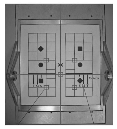 When a potential participant arrived at the testing facility, he or she was informed in writing and verbally about the testing procedures and asked to sign a consent form in accordance with Institutional Review Board protocol. The potential participant was then asked to complete the WOMAC (Western Ontario and McMaster University Arthritis) questionnaire, an in-house medical history and health status assessment. Testing was continued for participants who met the criteria. The participant warmed up prior to data collection and practice testing. To prevent falls, the participant wore a safety harness that was connected to two straps extending down from an overhead bar. The participant stood on the NeuroCom forceplate and then the safety harness was attached to the straps. Then, the participant’s feet were positioned on the forceplate by the investigator (Figure 2). The medial malleolus of each foot was centered directly over a thick line on the dual forceplate positioned perpendicularly to the participant. The lateral heel part of the shoes was positioned according to the participant’s height. The forceplate was marked with lines “S”, “M” and “T”, where