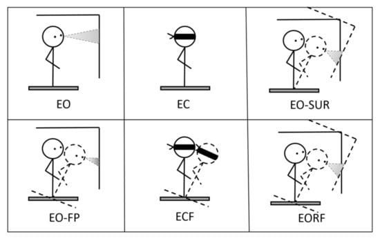 The sensory organization test (SOT) challenges postural control through sway referencing by changing the availability and/or accuracy of sensory information from three systems: visual, vestibular, and somatosensory. Sway referencing synchronizes the platform’s and/or surrounding room’s rotation with the person’s anterior–posterior postural sway; that is, as the person sways forward, the platform and/or surrounding area sways forward as well. The skew platform reduces or modifies the accuracy of somatosensory information, whereas the sway-referenced surroundings, extending beyond the visual periphery, provide inaccurate visual sensory information. These strategies challenge postural control by lowering the quality of sensory feedback on postural sway. The six sensory conditions of the SOT are as follows (Figure 3): (1) eyes open with fixed platform (condition 1); (2) eyes closed with fixed platform (condition 2); (3) eyes opened with sway-referenced surroundings (condition 3); (4) eyes opened with sway-referenced platform (condition 4); (5) eyes closed with sway-referenced platform (condition 5); and (6) eyes open with sway-referenced platform and surroundings (condition 6). Three trials for each sensory condition were presented in the order recommended by the manufacturer, with increasing difficulty from condition 1 to condition 6 (Table 2). Each SOT lasted approximately 10 min.