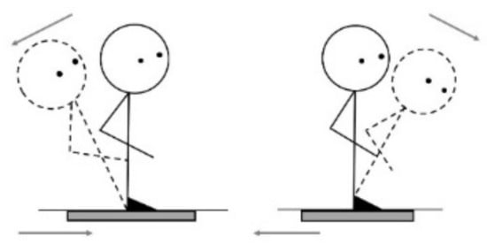 The MCT measured participants’ automatic reactions in response to support surface translations. Throughout the MCT, each participant kept their eyes open, and the surroundings remained stationary. The MCT had six conditions: three graded backward (3) and three graded forward (3) translations (Figure 4). The translations were scaled based on the participant’s height, but the durations were the same. Small, medium, and large translations produced translations of 1.25 cm for 250 ms, 3.14 cm for 300 ms, and 5.7 cm for 400 ms, respectively. Small translations represented threshold stimulation, large translations produced the maximum response, and medium translations were halfway between the small and large. Each translation took place at a constant velocity, transferring constant forward or backward angular momentum to the participant’s body [41]. The MCT lasted approximately 2 min.