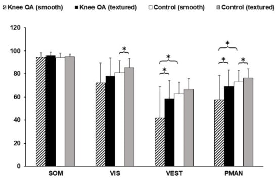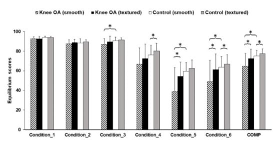 Although there were no interactions, paired t-tests were conducted to find out whether the textured insoles improved the balance of each group. In knee OA group, there were significant improvements in conditions 5 and 6, Comp, VEST, and PMAN when wearing the textured insoles. In the healthy knee control group, there were statistically significant improvements in condition 6, Comp, VIS, and PMAN when wearing the textured insoles.