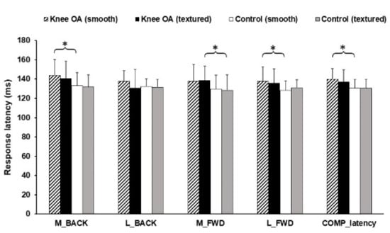 Figure 7 shows the Latency results for both groups. There was statistically significance of M_BACK (p = 0.037), L_FWD (p = 0.025) and COMP_latency (p = 0.008) between groups. This parameter was higher for the healthy knee group as well. Additionally, there were no significantly effects of the textured insole in both groups for latencies.