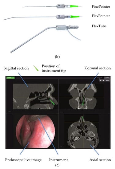 (a) Fiagon navigation system. (b) Fiagon navigation instruments for sinus surgery. (c) Output screen view with endoscopy image as well as sagittal, coronal, and axial CT sectional views [7,8].