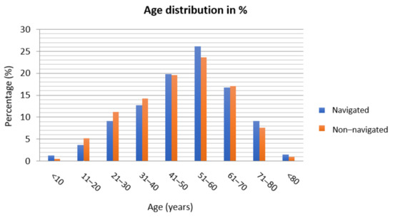 Based on their incision–suture times, the operations are divided into blocks with a class width of 30 min. For instance, in the segment of operations lasting less than 30 min, 89 were performed without navigation, which equates to the 10.7 percent of non-navigated cases included in the study. A total of seven classes are formed, the last one covering those operations with an incision–suture time of more than 180 min. The frequency distribution results are presented in the two bar charts in Figure 4, one showing absolute values and the other showing percentages.