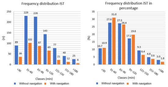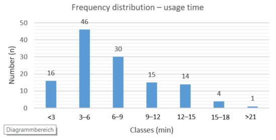 The following bar chart (Figure 3) shows a non-symmetrical distribution and is right-skewed. Nearly 50% of the navigation uses lasted less than 6 min. The most frequent class, with 46 entries, is the 3–6-min range, followed by the third class of 6–9 min, with 30 entries.