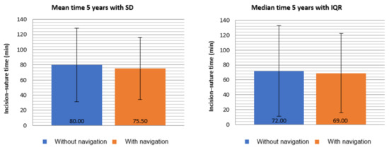 For operations without navigation, the overall mean time is 80 min, with a standard deviation of 45.6 min. By contrast, operations performed with the aid of a navigation device are a mean of 4.5 min shorter, hence, lasting 75.5 min, with a standard deviation of 40.6 min. The median operating times are additionally calculated. The median time is 69 min for navigated operations and 72 min for non-navigated surgery.