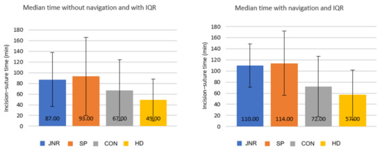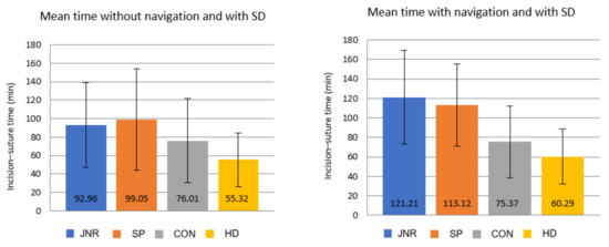 Consequently, the results of this study support the results of numerous studies that conclude that navigation systems result in longer operating times and higher expenditure [19,22,23,24]. However, a distinction must be made, because older papers still assume an additional surgical preparation time of up to 15 min, which is included in their calculations [25,26]. A system setup, taking place at the same time as regular preparations and patient registrations, which takes longer than 5 min is a rarity with modern navigation systems [2,17,27].