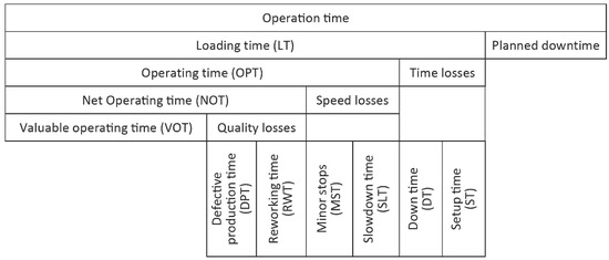 The TPM OEE indicator is based on a time model which considers three main categories of inefficiencies—time losses, speed losses, and quality losses—which are in turn divided and classified into “six big losses” [36,42]. These losses are described and represented in the OEE time model in Figure 1 which is adapted from Nakajima’s contribution [36,37]. The time model allows the different indicators that compose the OEE to be determined, namely: operating rate or availability (ORTPM), performance efficiency (PETPM), and quality rate (QRTPM). From these considerations, the OEE calculation methodology is reported as in Table 2 [36,37].