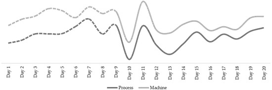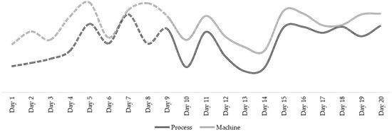 Figure 2, Figure 3, Figure 4 and Figure 5 provide, respectively, the data trend for the process and machine OEE, availability, performance efficiency and quality rate. Note that only the data trends for a period of 20 days are shown for confidentiality purposes, and no absolute values are reported and described. Moreover, in the different figures, the dashed curves show the performance recorded during the controlled tests conducted by the machine’s supplier technicians, while the continuous curves record the performances following the employment of the company’s operators for production.