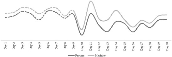 From these data, it is possible to observe a 11% increase in OEEmac and a 18% increase in OEEproc from day 13 to day 20. This OEE increase gap could be due to the operator training process: during this timeframe, operator training was sped up, resulting in lower human-process inefficiencies. Indeed, following the employment of the company’s operators for production (day 10) and the variability of day 11–12, the company decided to intensify the operator training process.