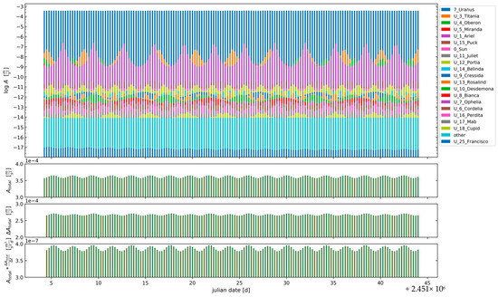 - Tittemore, W.C.; Wisdom, J. Tidal evolution of the Uranian satellites: III. Evolution through the Miranda-Umbriel 3:1, Miranda-Ariel 5:3, and Ariel-Umbriel 2:1 mean-motion commensurabilities. Icarus 1990, 85, 394–443. [Google Scholar] [CrossRef]
