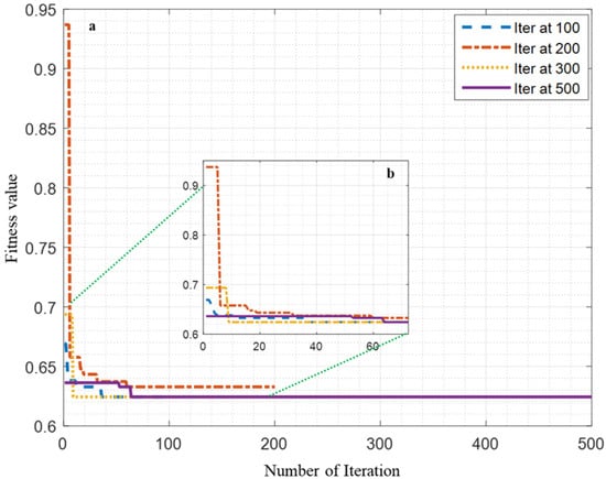 The best result for each iteration set is written in boldface in Table 2. Extending the search behavior by increasing the number of iterations up to 500 showed no significant change in minimizing the fitness value. From Table 2, the PSO reaches the best global minimum value at 100, 300, and 500 iterations with 0.6243, whereas the iteration at 200 reaches a near-global minimum value of 0.6328. The performance of PSO with 300 iterations is comparatively satisfactory in most of the tested optimization iterations. To illustrate this, Figure 4 depicts the PSO-convergence performance curves for lightning mapping estimation. The best optimal fitness value of the proposed algorithm is the one that exists at the lowest convergence time, which is achieved at optimization with 300 iterations. Hence, the optimization with 300 iterations was chosen for accurately estimating the lightning maps.