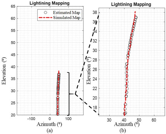 With a given captured lightning signal of antenna B, the signals of antennas C and D were simulated. The generated incident angles (Az and El) from the handcrafted lightning signals were assumed to be real positive and negative values. Figure 5 shows the simulated constructed lightning map using the PSO optimization algorithm, which occurred at 300 iterations. Figure 5a shows the constructed map of a lightning source location (Az and El angles). Meanwhile, Figure 5b shows the expanded view of the lightning maps. The point source was positioned at azimuth angles in the range of 40° to 50° and elevation angles of between 18° and 40°. Using the PSO algorithm, the elevation shape and the height of the channel of the simulated lightning map, shown in black, presented certain consistency with the handcrafted lightning map, shown in red.