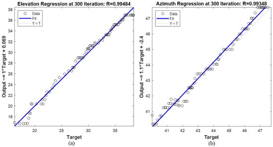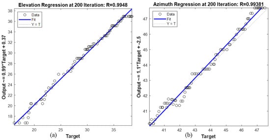 Lightning mapping regression performance at 200 iterations: (a) elevation regression performance; (b) azimuth regression performance.
