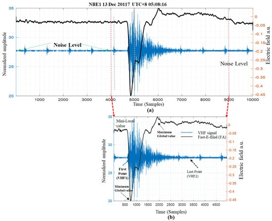 A total of three fast-electric fields related to FA and VHF signals are successfully identified by the lightning event extraction method. In this study, the fast-electric field polarity of positive NBEs flashes was identified based on the atmospheric electricity sign convention. Figure 8a shows the interferometer data for NBE1 that consist of VHF and fast-electric field waveforms, including the non-lightning parts. On the other hand, Figure 8b shows the proposed lightning event extraction method that determines the starting and ending points of the extracted fast-electric field (i.e., the first point VHF and the last point VHF signals).