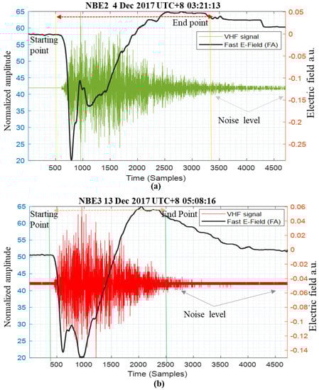 Figure 9 illustrates two other examples of the lightning event extraction method performed on two samples of the lightning (NBE2, and NBE3) flashes. The lightning event extraction method efficiently discards the noisy segments of the fas- electric field and VHF signal. Moreover, this method will potentially reduce the computation time and thus allows for faster signal processing of lightning events; it is also capable of reducing the lightning flash identification.