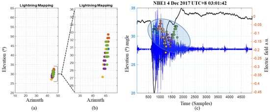 Interferometer data for NBE1: (a) lightning map plotted in elevation vs. azimuth; (b) expanded view of lightning map of (a); (c) the breakdown of each colored circle-marker denotes the elevation angles (altitude) vs. time.
