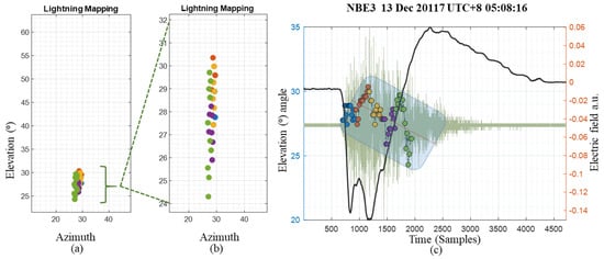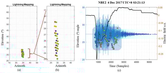 Interferometer data for NBE3: (a) lightning map plotted in elevation vs. azimuth; (b) expanded view of lightning map of (a); (c) the breakdown of each colored circle-marker denotes the elevation angles (altitude) vs. time.