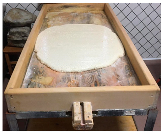 The acidification process is particularly important for stretched cheeses because a pH drop in the range 5.2–5.4 is necessary for stretching [21,22], since dicalcium paracaseinate is converted into monocalcium paracaseinate determining the formation of fibres that can be reorganized to give shape and sheen to the cheese [23]. A pH value > 5.4 does not allow stretching of the curd, while at pH below 5.2 the acidified curd is too tough due to the excessive fat loss [24]. After draining, the curd for PDO Provola dei Nebrodi cheese production is traditionally left to acidify at room temperature for about 24 h on a wooden open-topped table, namely “mastredda” [3] (Figure 1).