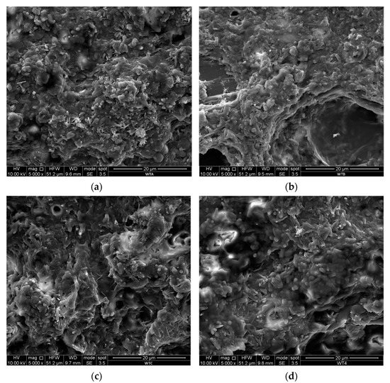 Scanning electron microscopy (SEM) observations of wooden splinters from wooden tables used during PDO Provola dei Nebrodi cheese production. Pictures of the wooden splinters from dairy factories A–D (a–d).