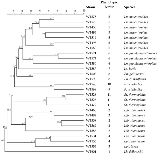 The highest number of groups (seven) was observed for cocci which presented three main cell arrangements: short chains (four groups), tetrads (two groups), and long chains (one group). Among these, two groups (5–6) were able to generate CO2 from glucose, displaying an obligate hetero-fermentative metabolism. The community of rod isolates included four groups and all of them showed a homo-fermentative metabolism. About 50% of the isolates representing each phenotypic group was analyzed by RAPD-PCR, a genotypic approach commonly applied, to perform the strain typing of the LAB associated with food products [35]. With this approach, 27 distinct RAPD profiles representing 27 strains were recognized (Figure 4), indicating the validity of this technique for differentiating LAB associated with the wooden equipment as previously reported by Cruciata et al. [12]. The sequencing of the 16S rRNA gene confirmed that all 27 strains belonged to the LAB group and they were allotted into nine genera (Enterococcus, Lactobacillus, Lacticaseibacillus, Lactiplantibacillus, Levilactobacillus, Lactococcus, Leuconostoc, Pediococcus and Streptococcus). The 11 species identified were deposited to GenBank as follows: Enterococcus casseliflavus (Ac. No. MZ669935); Enterococcus gallinarum (Ac. No. MZ669936); Lactobacillus delbrueckii (Ac. No. MZ669937); Lactococcus lactis (Ac. No. MZ669938); Lacticaseibacillus rhamnosus (Ac. No. MZ669939-MZ669943); Lactiplantibacillus plantarum (Ac. No. MZ669944-MZ669945) and Levilactobacillus brevis (Ac. No. MZ669946); Leuconostoc mesenteroides (Ac. No. MZ669947-MZ669953); Leuconostoc pseudomesenteroides (Ac. No. MZ669954-MZ669956); Pediococcus acidilactici (Ac. No. MZ669957-MZ669958); Steptococcus thermophilus (Ac. No. MZ669959-MZ669961). All these species are generally associated to dairy environments such as raw milk [50], cheeses [35,46], animal rennets [19] and wooden vats [11], considering that Lcb. rhamnosus, Lpb. plantarum and Lvb. brevis were formerly Lactobacillus rhamnosus, Lactobacillus plantarum and Lactobacillus brevis, respectively [65]. In particular, Lcb. rhamnosus are typically associated to the ripening of PDO Provola dei Nebrodi cheese and have been recently object of selection for non starter LAB addition due to their desirable technological and enzymatic activities [66]. Pediococci are also generally isolated from semi-ripened PDO Provola dei Nebrodi cheeses [67].