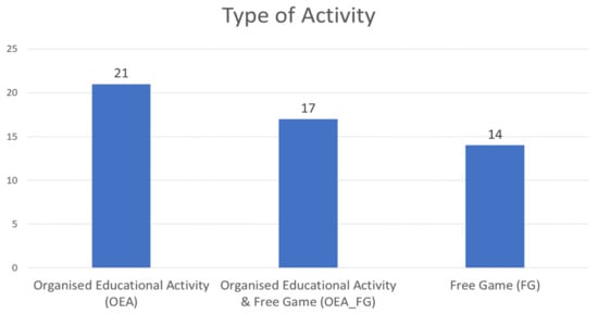 Play includes a wide range of voluntary, internally driven activities with reactional pleasure and fun [6]. In addition, play is mainly associated with children without this, meaning that it could not occur at any stage of human life. There are different types of play, such as natural/play (movement, strength etc.), social play, creative constructions play and imaginary play. Combinations of play can also result from the above, such as social and fantasy play together. In addition, play as an activity can be both outdoors and indoors.