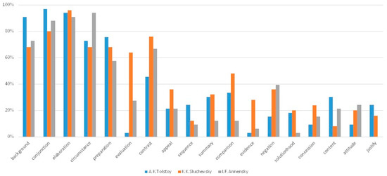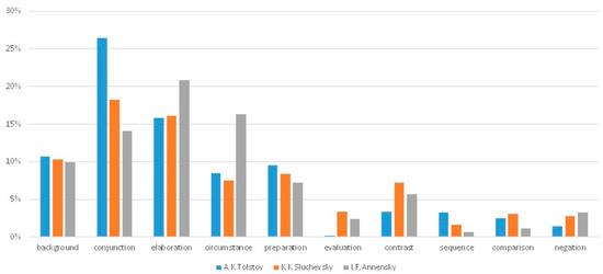 The quantitive information in the diagram shows the percent of subject matter relation’s occurrences and presentational relation’s occurrences among the total number of occurrences in the corresponding set of texts. For instance, among 682 relation’s occurrences in the set of A.K. Tolstoy’s texts, 31.23% of occurrences correspond to the subject matter relations.