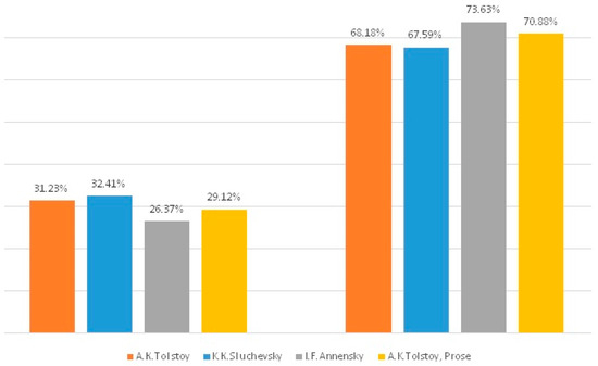 For the sake of stylistic homogeneity, the poetic language material contains only lyrical verses. The considered poetic texts are small or medium in size. The median number of lines in the analyzed poetry of A.K. Tolstoy, K.K. Sluchevsky, and I.F. Annensky amounts to 18, 16, and 14, correspondingly. Therefore, the set of considered poetic texts does not include the A.K. Tolstoy’s ballades and dramatical pieces, as well as the large poetic texts written by K. K. Sluchevsky and I.F. Annensky. The analyzed material does not contain any incomplete fragments of verses; each verse is present in its entirety. This holistic approach is valuable because it makes the reasoning reflected in a text integral and complete.