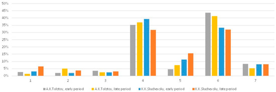 Figure 4 visualizes the distribution of occurrences for early and late period of creative activity. In each group of four columns, the first and second, grey and yellow, columns show, correspondingly, the early and the late periods for A.K. Tolstoy, the third and fourth, blue and red, columns—the information is similar for K.K. Sluchevsky. The numbers below correspond to the abovementioned semantic groups of relations. The principles of calculating percentages are the same as they were for the previous diagrams. We can see certain differences that are specific in the early periods, the late periods, or both periods.