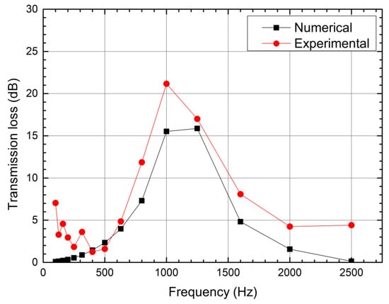 - A prototype of a soundproof panel (1960 mm (W) × 127.5 mm (L) × 1000 mm (H)) with a resonance frequency of 1000 Hz was built and the transmission loss was measured in a reverberation room for verification. From the comparison result, a similar pattern of transmission loss is observed between numerical and experimental results and apparent transmission loss at the resonance frequency of 1000 Hz, but the discrepancy between two curves, especially near the resonance frequency, can be observed, which should be identified for developing a reliable design procedure via further studies.